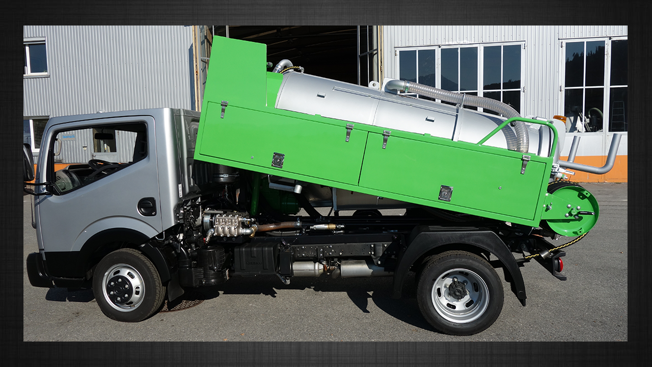 - Schlauchtrommel hydraulisch angetrieben mit ca. 60 Meter HD-Schlauch DN 13, seitlich montierte Füllschlauchtrommel mit 40 Meter Flüllschlauch DN 19, händische Bedienung und Schlauchablage für 40 Meter Saugschlauch DN 60